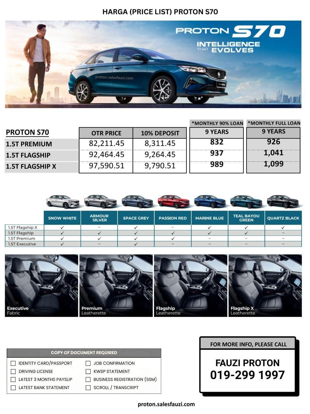 Dapatkan info terkini mengenai harga, pricelist dan promosi Proton S70 2026 terbaru disini. Sebagai Sales Advisor Proton yang berpengalaman lebih 10 tahun di kawasan Bangi & Kajang, Fauzi Proton sedia membantu anda memahami setiap varian yang ditawarkan—dari Proton S70 Executive sehinggalah ke varian Flagship X. Proton S70 2026 Kini dikuasakan dengan enjin i-GT 1.5 liter empat-silinder turbo, Safety features bertaraf 5-bintang dan teknologi canggih. Harga Proton S70 2026 dijangka akan diumumkan pada hari pelancaran 11/02/2026. WhatsApp atau Call butang di bawah untuk sebarang pertanyaan atau maklumat lebih lanjut.